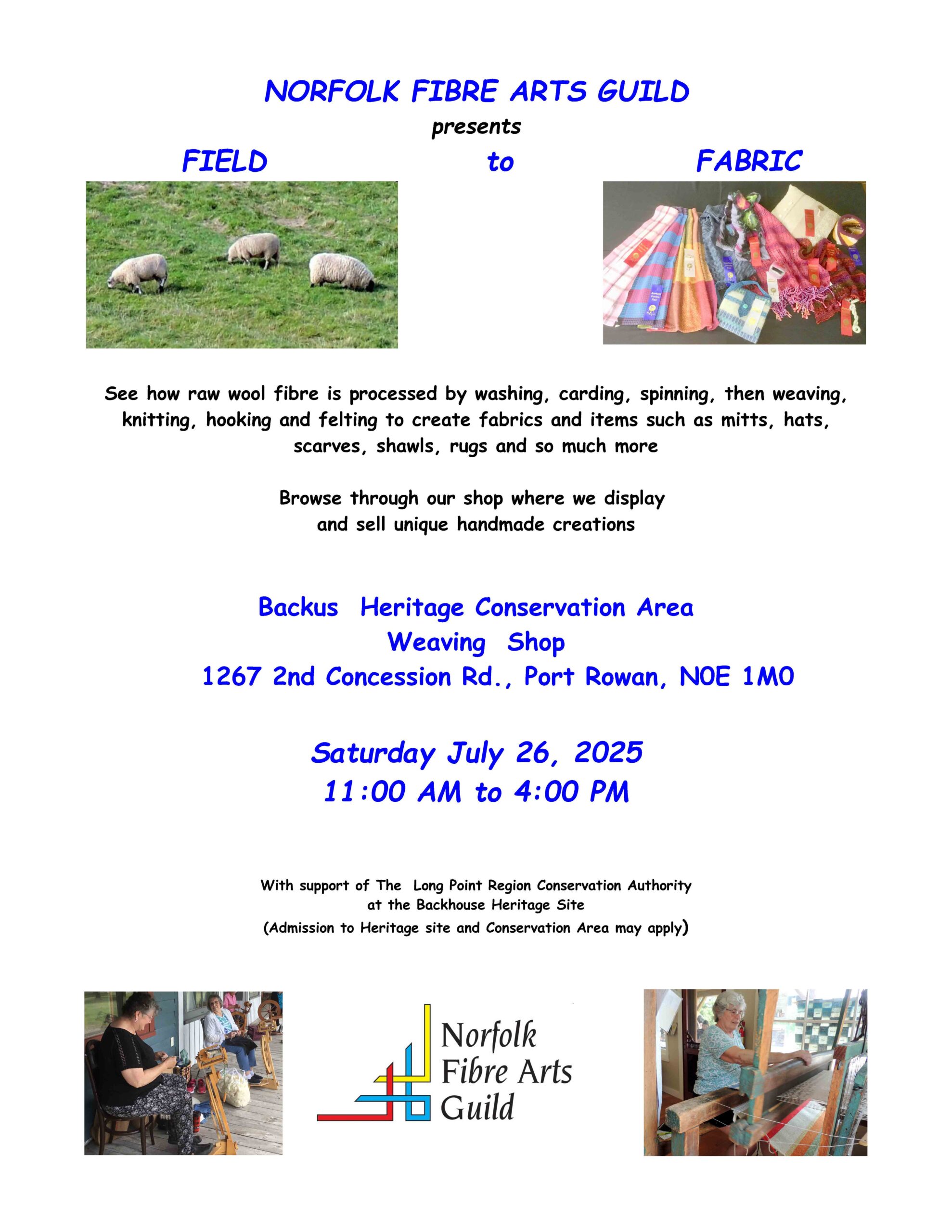 Field to Fabric: Visit the Norfolk Fibre Arts Guild at the Mercantile building as they give demonstrations on spinning wool into yarn and weaving their yarn into beautiful fabric creations.